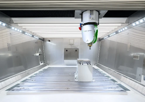 Die Linearachsen der Maschine erreichen Vorschubgeschwindigkeiten von bis zu 60 m/min und Beschleunigungen bis zu 3 m/s². Diese Dynamik ermöglicht schnelle Positionierbewegungen und verkürzt Bearbeitungszeiten – ein entscheidender Vorteil bei der Serienfertigung komplexer Bauteile.